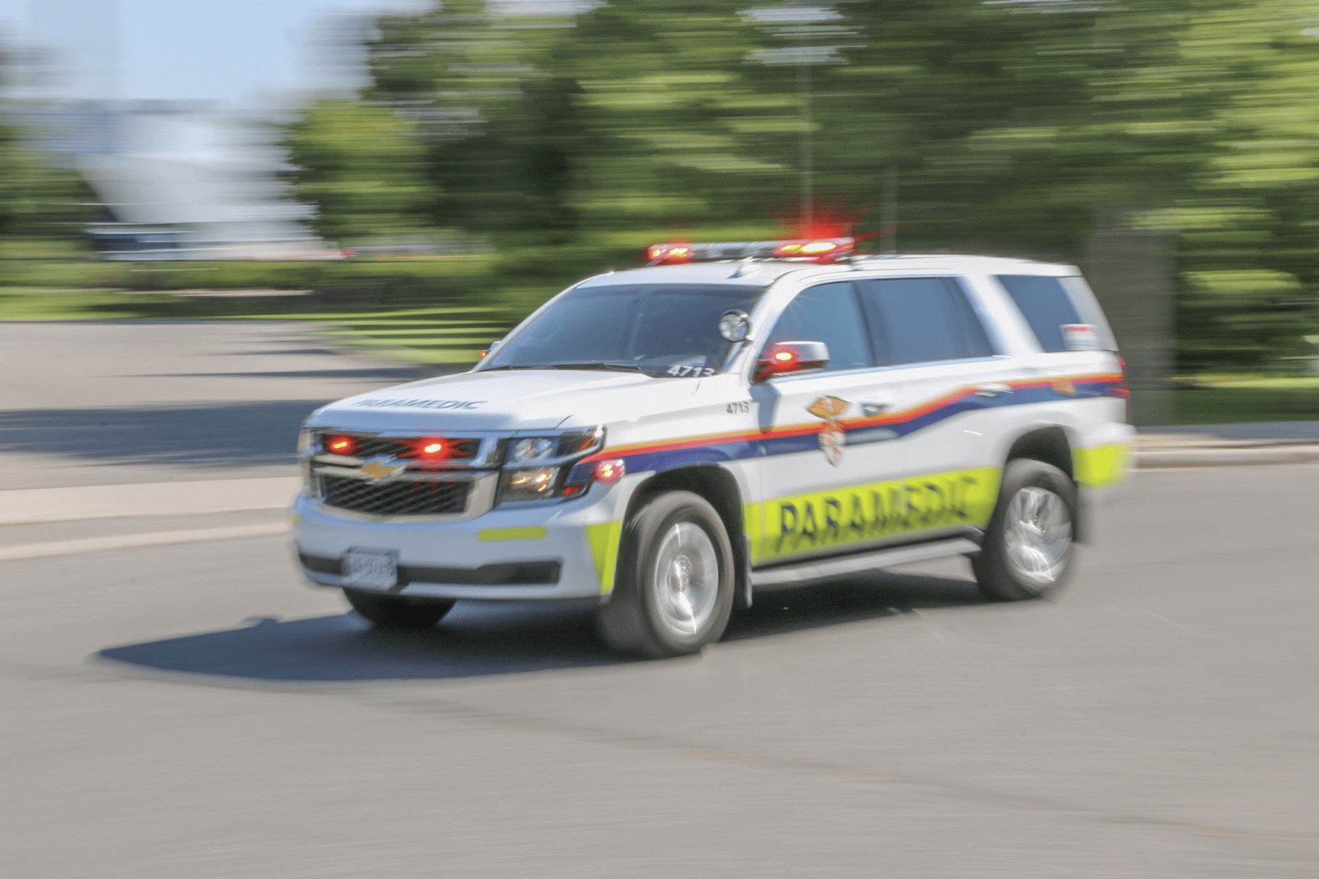 Ottawa paramedic SUV responding with lights on, symbolizing emergency medical response to a jogger’s cardiac arrest at Neill Nesbitt Park