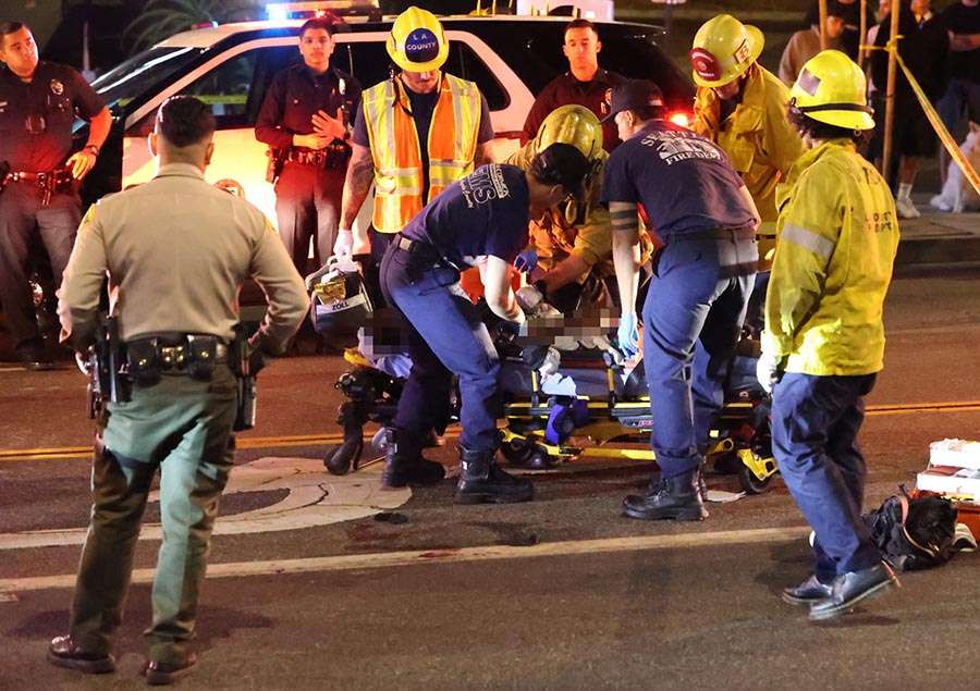 Pedestrians and first responders at nighttime crash scene in Pitt Meadows after man struck while hailing a taxi.